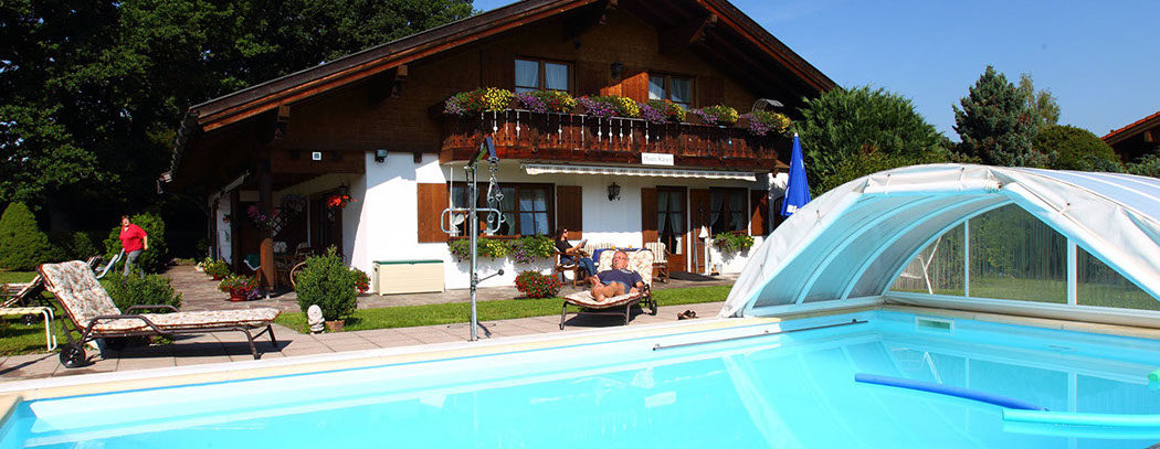 Unser Grundstück bietet Ihnen alles, was man sich im Urlaub nur wünschen kann: Sei es die üppige Liegewiese, der barrierefreie Pool, der Kinderspielplatz oder der atemberaubende Blick auf den Grünten und die Oberstdorfer Berge.